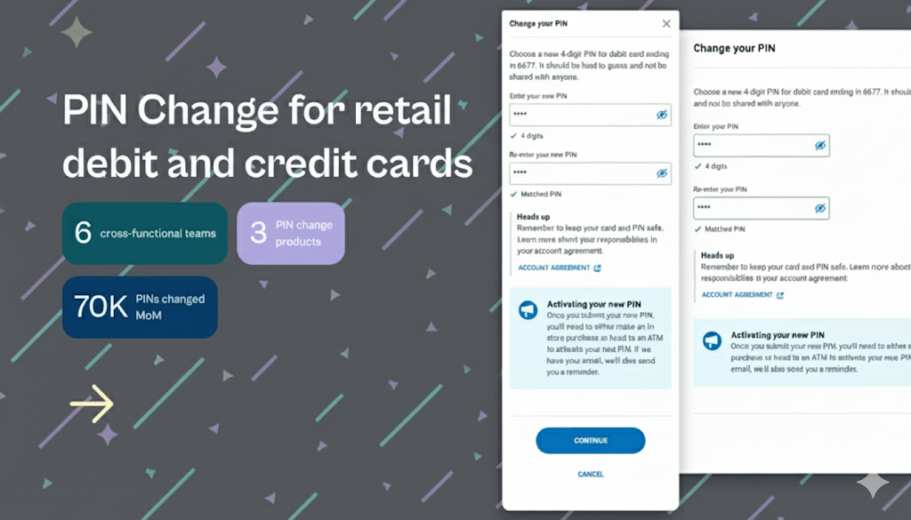 Quantifiable Metrics: The successful introduction of the digital PIN reset feature immediately drove high engagement and product usage. The feature quickly scaled to approximately 70,000 PIN changes month-over-month, proving that customers strongly preferred the digital self-service channel. Furthermore, the project required the coordination of six cross-functional teams and successfully enabled the feature across three major product lines (debit cards, credit cards, and business banking cards), demonstrating high product reach and significant scale within the bank’s digital ecosystem.